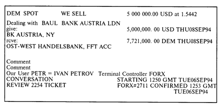 Приводиться зразок сформованого апаратурами «тікету», а нижче - текст переговорів. У першому рядку тексту угоди вказується кому зроблений дзвінкий: ТЕ BAUL - дзвінок з нашого банку в банк із кодом BAUL, що розшифровується як Bank Austria, London. Далі в рядку йде вказівка часу по грінвічеському меридіані - 12-50 GMT або 16-50 за московським часом; потім - дата переговорів й, отже, висновку угоди б вересня 1994 р. і порядковий номер переговорів у комп'ютерній пам'яті. Наступний рядок показує ділінговий код банку, що зробив дану роздруківку - FORЕX (КБ «ФОРЕКС», Москва) і ім'я користувача - Іван Петров.