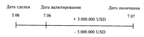 Наприклад, 5 червня 1995 р. комерційний банк ААА розмістив зі спота (тобто з 7 червня) 5 млн. доларів США на місячний депозит в іншому банку під 6 відсотків й у цей же день уклав угоду із третім банком по залученню 5 млн. доларів також зі спота (з 07.06) на місяць під 5 відсотків.