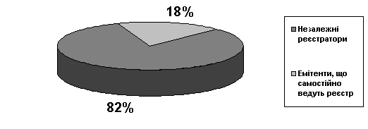 Рис.1. Частки установ, що ведуть реєстри власників іменних цінних паперів у загальній кількості реєстраторів