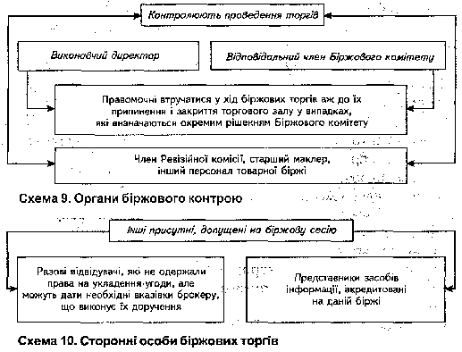 Так, на Українській аграрній біржі учасниками торгів є: * брокери зі своїми помічниками, що діють на підставі доручення брокерської контори, яка подала до УАБ заявку на участь у біржових торгах та акредитаційну картку. Біржові угоди на УАБ укладаються виключно брокерами; * біржові маклери, у тому числі старший маклер, представники апарату УАБ, що ведуть торги та реєструють усну згоду брокерів на укладення біржової угоди. У процесі біржових торгів уповноважені особи товарної біржі затверджують та реєструють учасників біржових торгів, призначають біржових ведучих, спостерігають за дотриманням маклерами та брокерами Правил біржової торгівлі при проведенні торговельних сесій, затверджують укладені угоди, контролюють їх виконання та інформують через засоби масової інформації про результати торгів. Особи, які контролюють проведення біржових торгів, не мають прав на укладення угоди. Особи, крім виконавчого директора та відповідального члена Біржового комітету, не можуть прямо або опосередковано втручатися у процес їх ведення. До обов'язків виконавчого директора та відповідального члена Біржового комітету входить контроль за дотриманням правил біржової торгівлі і вирішення проблем, які виникають у ході біржових торгів, їх розпорядження і рішення є обов'язковими для всіх учасників біржових торгів.
