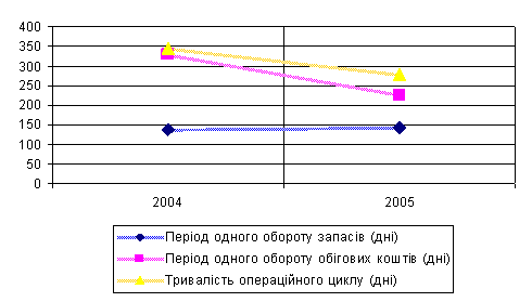 Тривалість операційного циклу на підприємстві складає 193 дні у 2005р., що на 34 дні менше ніж у минулому році. Тривалість перетворення товарів, на грошові кошти складає 193 дні у 2005р., 277 днів у 2004р. та 345 днів у 2003р. Підприємство живе в «борг», оскільки значення показника фінансового циклу від’ємне.