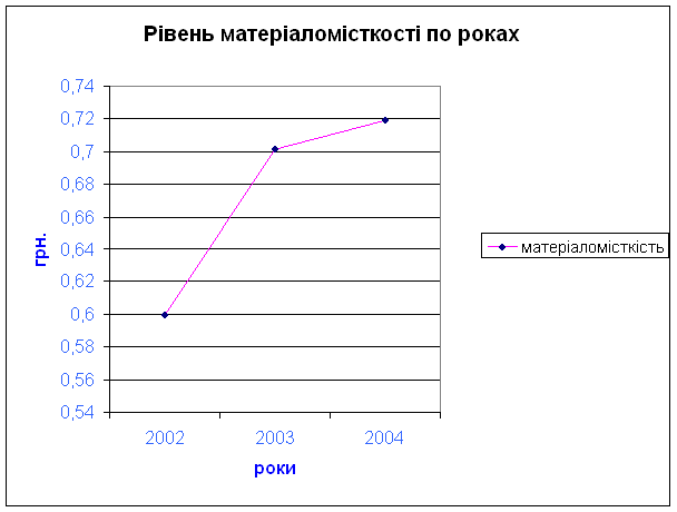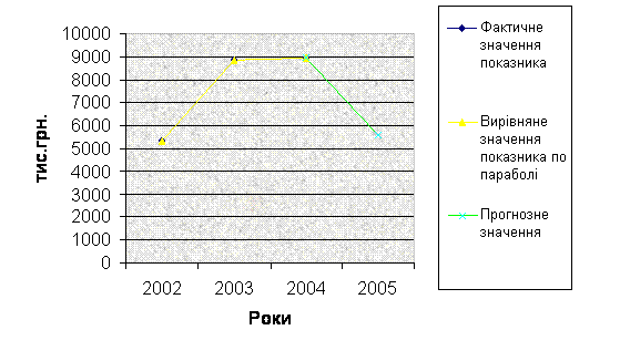 Як видно з графіку прогнозне значення показника на 2005 рік очікується меншим ніж у 2003 та 2004 роках. Причиною цього є низьке значення матеріаломісткості у 2002 році. Так як метод екстраполяції враховує середні значення показника за 3 роки і таке високе зростання показника при таких збитках не може продовжуватись довго то на мою думку прогнозне значення є абсолютно закономірним, що підтверджує правильність обраного методу для прогнозування. | |
