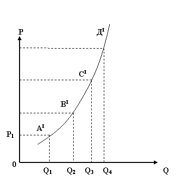 2) чим ближче положення кривої до осі абсцис (горизонтальної), тим пропозиція еластичніша (відрізок А1Д1 ), коефіцієнт еластичності більший від одиниці (Е>1);