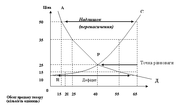 У результаті взаємодії попиту, пропозиції та конкуренції встановлюється ринкова ціна, яка урівноважує обсяг пропозиції і обсяг попиту. У нашому прикладі вона відповідає точці перетину кривих попиту АД і пропозиції ВС (точка Р), яку називають рівноважною ціною, - це ціна 25 грн. за одиницю товару. Тільки при даній ціні реальний обсяг попиту і обсяг пропозиції будуть однакові – 40 одиниць товару за місяць. Тобто ця ціна визначає стан товарного ринку, коли для реалізації пропонується саме така кількість товару, яку споживач готовий купити. При ціні 50 грн. за одиницю товару виникає надлишок пропозиції над попитом у кількості 50 одиниць. За ціною 10 грн. за одиницю товару попит перевищує пропозицію в кількості 65 одиниць, і виникає дефіцит даного товару на ринку. При ціні ринкової рівноваги – 25 грн. за одиницю товару кількість товару, яку споживач хоче купити, дорівнює тій кількості товару, яку виробники хочуть постачати на ринок (продати). І лише за такої рівноважної ціни не буде тенденції до зміни ціни на даний товар (зростання або зниження). Отже рівноважна ціна, або ціна ринкової рівноваги, встановлюється в результаті взаємодії попиту і пропозиції, конкуренції та інших чинників. Проте ця рівновага на товарному ринку є частковою рівновагою. В умовах конкуренції під впливом законів ринкового ціноутворення рівноважна ціна може змінюватися, а отже, може змінюватися ринкова рівновага. Головними чинниками тут є співвідношення обсягу попиту і обсягу пропозиції. Тому випадкове втручання у механізм попиту та пропозиції може завдати шкоди національній економіці. Рівновага на товарному ринку є свідченням досягнення максимальної ефективності розвитку ринкової економіки.