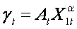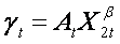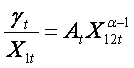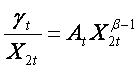 Параметр Аt відображає вплив відсутнього фактору (наприклад, трудових ресурсів) в моделі (5) на ефективність розглядуваного фактору. Так, збільшення Х1t в n разів дає збільшення γt в n2 разів, якщо α>1 і, відповідно, збільшення Х2t в n разів приводить до зростання γt в nβ разів, якщо β>1. При α(β)<1 ріст відповідного фактору понижується, при цьому показник ефективності γt/X1t (γt/X2t) не обов’язково знижується, оскільки на його динаміку має вплив і Аt.