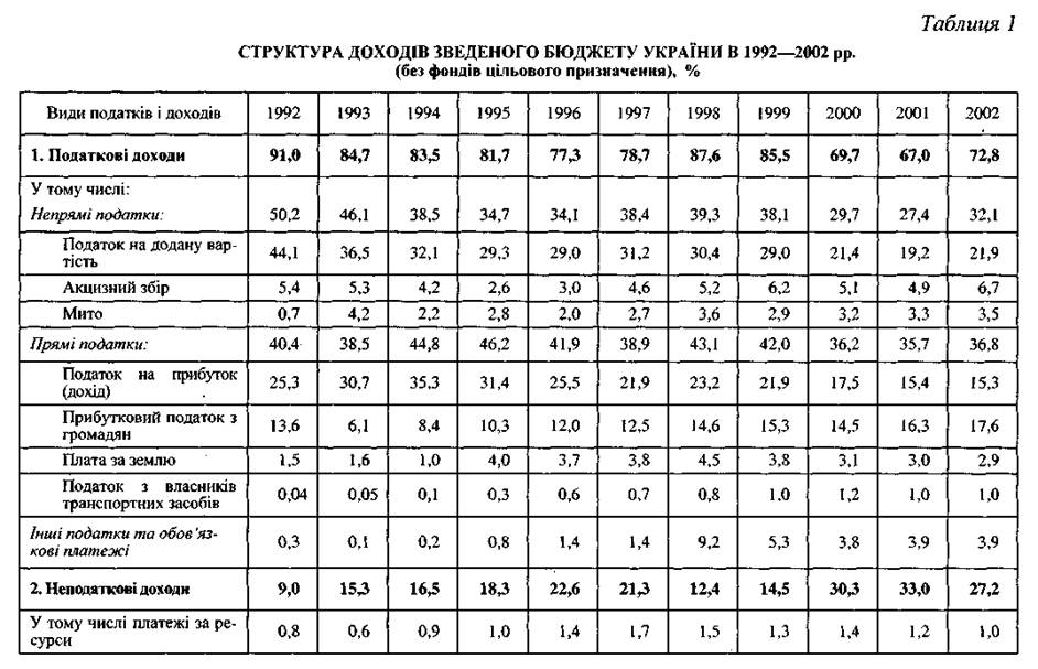 Склад і структура доходів бюджету характеризують фінансову політику та фінансовий стан держави. Дані про бюджет України (за вирахуванням фондів цільового призначення) наведені в табл. 1. Як видно з них, структура доходів бюджету досить швидко змінюється, що пояснюється постійними перетвореннями і змінами в податковій системі України і неподаткових надходженнях до бюджету. Починаючи з 1992 р. бюджет формується головним чином за рахунок податкових надходжень (рис. 2).