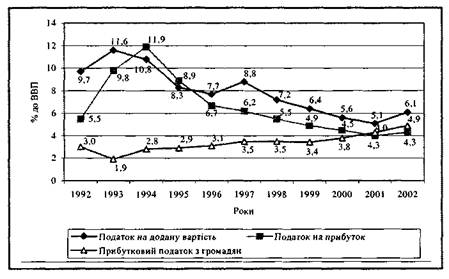 Рис. 4. Роль основних податків у ВВП (1992—2002 рр.)