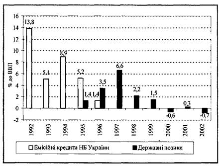 Проблема покриття дефіциту бюджету з'явилася в 1991 р. Починаючи з цього року сума доходів бюджету в порівнянних цінах почала зменшуватись, що було спричинено початком економічної кризи. В умовах відсутності цивілізованих методів фінансування дефіциту бюджету за рахунок випуску державних цінних паперів, перевищення видатків над доходами покривалося за рахунок емісійних кредитів Національного банку України. Наслідком цього стали величезні темпи інфляції. Тільки в 1994 р. фінансування дефіциту бюджету було частково здійснено за рахунок іноземних кредитів, а з 1995 р. — і за рахунок розміщення державних цінних паперів (рис. 5). Найвищим дефіцит бюджету був у 1992 р. — 13,8 % ВВП. Надалі бюджетна політика спрямовувалася на поступове зменшення дефіциту. Так, у 1999 р. дефіцит становив 1,5 % ВВП, в 2000 р. бюджет був зведений з профіцитом у розмірі 0,6 % ВВП, а в 2001 р. — з дефіцитом у розмірі 0,3 %, у 2002 р. — з профіцитом у розмірі 0,7 %.