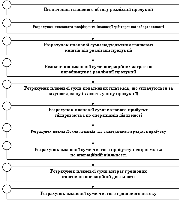 1. При прогнозуванні надходження і витрати коштів по операційній діяльності виходячи з планованого обсягу реалізації продукції розрахунок окремих показників плану здійснюється в такій послідовності (рис.).