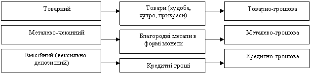 Сучасна грошова система є результатом багатовікового процесу розвитку товарного виробництва. Як вона сформувалася? Історії відомо три типи загальних еквівалентів: товарний, металево-чеканний та емісійний (вексельно-депозитний). Тобто, спочатку грішми були товари (товаро-гроші) - худоба, зерно, хутро, прикраси тощо. Згодом в якості грошей стали виступати благородні метали (золото, срібло). Основним видом грошей цього періоду були монети48. І, нарешті, виникають кредитні гроші в формі паперових грошей (казначейські білети, банкноти) - банківських рахунків, чеків, кредитних карток, електронних грошей.