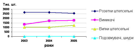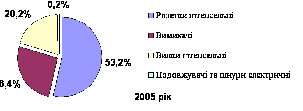 Отже, найбільшу частку у створюваній підприємством продукції займають розетки штепсельні. Це пов’язано з великим попитом на цей вид продукції. В той же час дуже мала частка подовжувачів та шнурів електричних пов’язана з присутністю на ринку великої кількості конкурентної продукції цього виду.