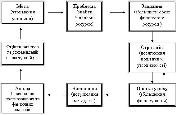 Головна відмінність методології програмно-цільового методу від традиційного постатейного методу формування бюджету полягає у різниці підходів до проблем, які підлягають вирішенню а також, у різному наборі інструментів, що використовується для вирішення цих проблем. Цю різницю наглядно представлено на рис.2.1 та 2.2. На рис.2.1 відображено спрощену модель традиційного постатейного процесу формування бюджету.