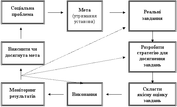 Програмно-цільовий метод докорінно відрізняється від традиційного методу. Він ґрунтується на раціональному управлінні, тобто його метою є не збереження організаційної структури, а вирішення соціальних проблем. Організації не фінансуються просто тому, що вони існували раніше, кількість персоналу, що працює у бюджетній сфері, не залишається сталою. Навпаки, програмно-цільовий метод намагається внести покращення в існуючі організаційні методи роботи і фінансувати тільки ті установи, які найбільшою мірою сприяють досягненню поставлених цілей. Метод програмно-цільового фінансування використовує систематичний підхід до визначення завдань та цілей установ як складових бюджетного процесу, встановлюючи прямий зв'язок між використаними ресурсами та досягнутими результатами, як у середньостроковій, так і довгостроковій перспективі досягнення поставлених цілей. Ці відмінності проілюстровано на рис.2.2.