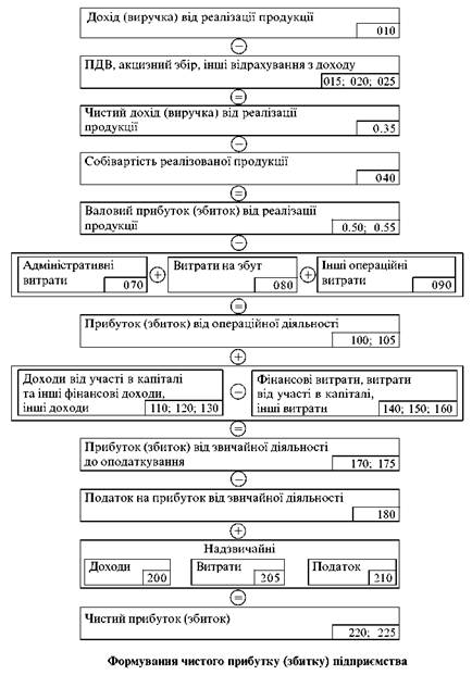 Послідовність формування чистого прибутку (збитку) підприємства показано на рис. 5. У нижньому правому кутку прямокутників містяться посилання на коди рядків форми № 2 .
