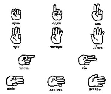 Мал.1. Зображення цифр з допомогою пальців Будь-яке число можна зобразити за допомогою п'яти пальців відкритої долоні. При цьому для чисел від нуля до п'яти долоня розташована вертикально, від шести до десяти горизонтально. Нуль позначають піднятим стислим кулаком (мал. 1).
