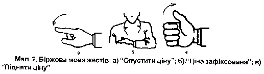 На біржах під час торгів брокери в основному викрикують свою інформацію. Наприклад, якщо маклер прочитав позицію, представлену брокером, а на неї ніхто не відреагував, то брокер може знизити ціну. Для цього він викрикує, наприклад: "Знижую на 100". Якщо знову немає бажаючих, то брокер робить маклеру знак знизити ще раз (мал. 2, а). Так повторюється до тих пір, поки це здається прийнятним для брокера-продавця. Якщо ціна зафіксована, то брокер показує це зігнутою в лікті горизонтально розташованою рукою долонею вниз (мал.2, б). Брокер може підняти ціну. Це робиться рухом великого пальця вгору (мал. 2, в).