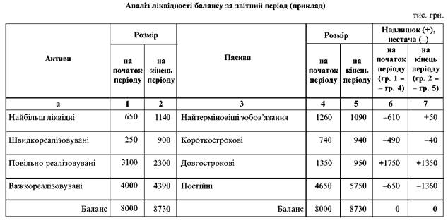Наведений баланс як на початок, так і на кінець року не є абсолютно ліквідним. На початок року найліквідніші активи покривають найтерміновіші зобов'язання лише наполовину (51,5 %); швидкореалізовуваних активів вистачає лише на 33,8 %, щоб погасити короткострокові зобов'язання. Важкореалізовуваних активів також не вистачає для покриття постійних пасивів. Тільки за третьою групою активи істотно перевищують пасиви — майже на 130 %.