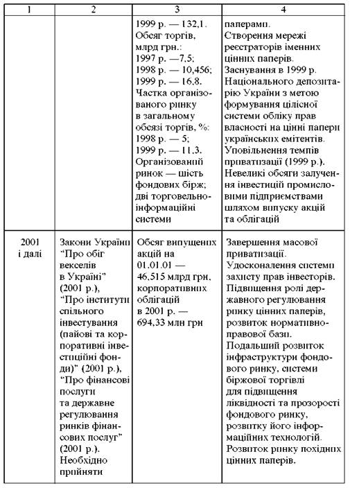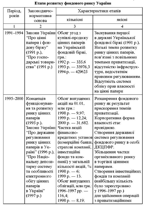 Як свідчить історія, обіг корпоративних цінних паперів став результатом довготривалого еволюційного розвитку економіки і зростання потреб підприємств, що ефективно працюють, у додаткових фінансових ресурсах, які почали залучатися через фондовий ринок. В Україні ж корпоративні цінні папери з'явилися не з об'єктивних причин, а були штучно ініційовані програмою приватизації та корпоратизації державних підприємств. Отже, питома вага акцій, випущених внаслідок корпоратизації державних підприємств у 1994– 1998 рр., становила майже половину загального обсягу зареєстрованих ДКЦПФР емісій акцій, а акції, що були емітовані на загальних підставах (тобто з метою розміщення самими підприємствами серед інвесторів для залучення додаткових коштів), — близько 20 % [46, с. 5]. Ця тенденція зберігалась і надалі. Так, за вісім місяців 2001 р. (з січня по серпень) було випущено акцій з метою залучення коштів (за даними ДКЦПФР) на суму 619,56 млн грн, тоді як загальний обсяг випуску акцій становив 8319,1 млн грн. Іншими словами, більшість первинних емісій акцій не сприяла залученню реальних коштів в економіку, а лише обслуговувала процес приватизації і надходження в бюджет доходів від продажу належних державі часток у корпоратизованих підприємствах. Ринок цінних паперів створювався на тлі щорічного спаду ВВП, уповільнення процесу відтворення та зниження рентабельності підприємств. За 1990–1996 рр. щорічний темп спаду ВВП становив 13 % при загальному зниженні за 6 років на 57 % (з 1997 р. темпи зниження уповільнилися, а в 2000 р. вперше за 10 років зафіксовано зростання на 6 % порівняно з 1999 р.)