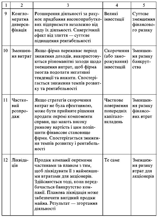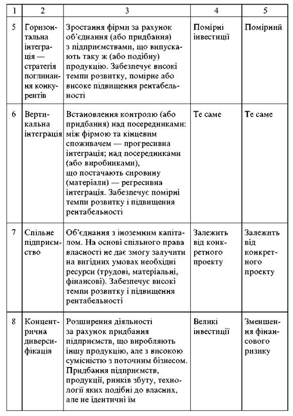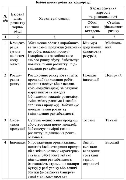 Існує 12 головних напрямків, на яких базується формування стратегії економічного розвитку корпорації. їх перелік, зміст, а також характеристика з погляду потреби у фінансуванні (обсяг капіталовкладень) та ступеня фінансового ризику наведено в табл. 6.1. Великі корпорації, як правило, формують на основі поєднання кількох напрямків власну складну стратегію розвитку на певний період часу. Поєднання кількох напрямків розвитку одночасно необхідне в багатопрофільних компаніях, щоб відобразити особливості видів виробничо-господарської діяльності, яку здійснюють різні підрозділи. Навіть компанії, які мають один вид основної діяльності, часто компонують на основі зазначених в табл. 6.1 базових ізольованих підходів складнішу і багатограннішу стратегію. Наприклад, скорочення видатків і продаж окремих допоміжних об'єктів може поєднуватися з розвитком ринку і продукції.