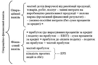 Валова маржа — це різниця між виручкою і змінними витратами; прибуток у цій формулі визначається як сума прибутку до сплати податку на прибуток і суми відсотків за позики (це показник ЕВІТ). Отже, операційний важіль впливає на проміжний фінансовий результат — ЕВІТ, тоді як фінансовий важіль — на кінцевий фінансовий результат — EPS.