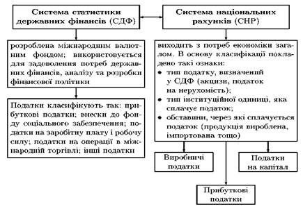 У міжнародних стандартах зі статистики та обліку використовують такі класифікації податкових платежів: