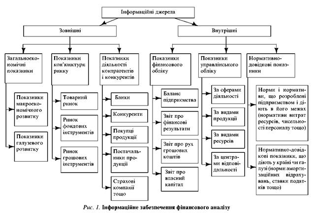 Залежно від змісту та задач фінансового аналізу використовують такі основні інформаційні джерела: фінансову звітність; статистичну звітність; дані внутрішньогосподарського (управлінського) бухгалтерського обліку; вибіркові дані; експертні оцінки. Сучасні технології фінансового аналізу потребують суттєвого розширення інформаційної бази. Окрім стандартних форм фінансової та статистичної звітності, використовуються позаоблікові зовнішні щодо підприємства джерела інформації, що характеризують стан зовнішнього економічного середовища: ринків товарів і послуг (періодичні видання прайс-листів), внутрішнього та міжнародного фінансових ринків, систем оподаткування тощо. Створюються комплексні автоматизовані інформаційні системи комерційної інформації з регулярним оновленням даних, використовуються можливості сучасного інформаційного забезпечення, що їх надає Internet.