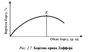 Зростаюча вірогідність дефолту призводить до зниження вартості запозичень. Визначити оптимальний рівень списання боргу, за якого досягаються максимально очікувані виплати, можна за допомогою боргової кривої Лаффера (рис. 2.7).