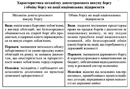 Переваги і недоліки механізму довгострокового викупу боргу та обміну державного боргу на акції національних підприємств наведе-ні в табл. 2.8.