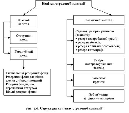 Статутний фонд та гарантійний фонд утворюють власний капітал страхової компанії. Страхові резерви разом з отриманим капіталом на фінансовому ринку утворюють залучений (зовнішній) капітал (рис. 4.6).