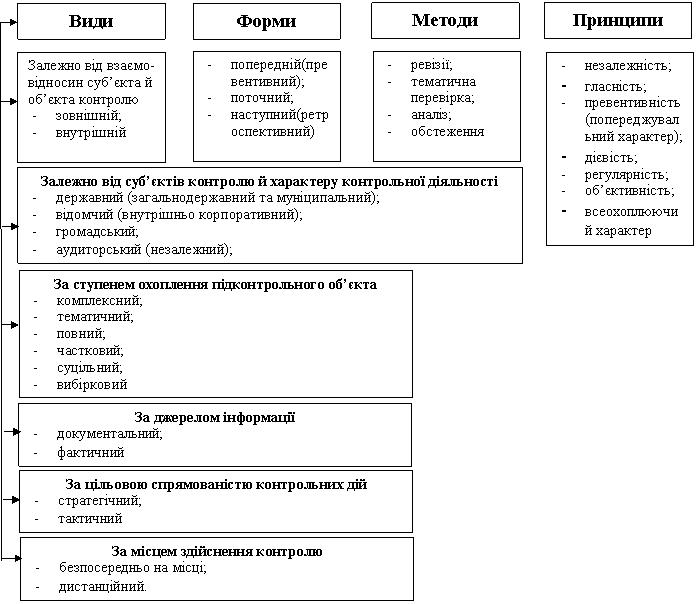 Як система фінансовий контроль має види, форми, принципи і методи, які представлені на мал. 1