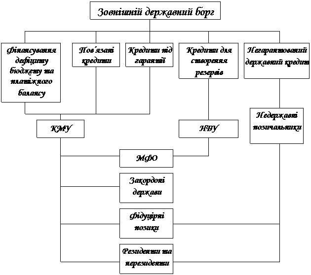 Виходячи з критеріїв мети залучення і використання коштів, зовнішній борг України розбивається на такі групи: