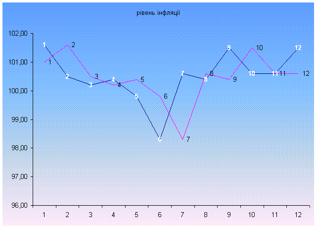 З гістограми на рис. 3.1. видно, що найбільшого рівня інфляція досягла в січні 2001 року (101,6%), а найменшого – в червні 2001 року (98,3%).