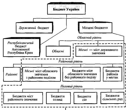 На загальнодержавному рівні формується центральний бюджет нашої країни — Державний бюджет України. На обласному рівні формуються Республіканський бюджет Автономної Республіки Крим та обласні і міські (міст державного значення) бюджети. На районному рівні формуються районні бюджети (сільських районів) та міські (міст обласного значення з районним поділом) і бюджети міст обласного значення без районного поділу. Сюди ж можуть бути віднесені бюджети районів у містах. На низовому рівні формуються бюджети міст районного значення, селищ, сіл та бюджети сільських Рад (якщо одна сільська Рада об'єднує двоє чи більше сіл, то у них формується один бюджет). Усі бюджети, які утворюються в населених пунктах, належать до бюджетів місцевого самоврядування.