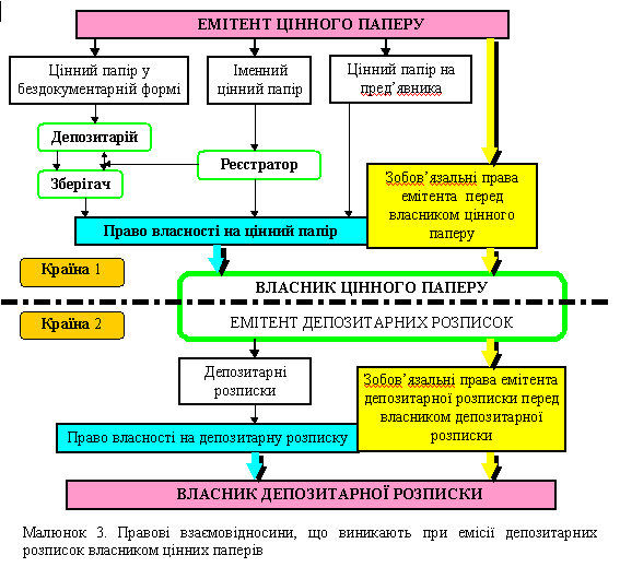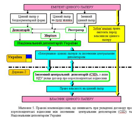 Реалізується цей “вихід” через встановлення кореспондентських відношень між центральними депозитаріями двох країн або між центральним депозитарієм країни емітента цінних паперів із міжнародними депозитарними центрами (Еuroclear, Cedel). Встановлення таких кореспондентських відношень визначається правовими умовами і відповідає європейському шляху обігу цінних паперів за межами держави. Враховуючи вимоги українського законодавства вихід цінних паперів українських емітентів на іноземні фондові ринки цінних паперів можливо реалізувати через укладання Національним депозитарієм України договору про кореспондентські відношення з закордонним депозитарієм (центральним депозитарієм) (малюнок 5).
