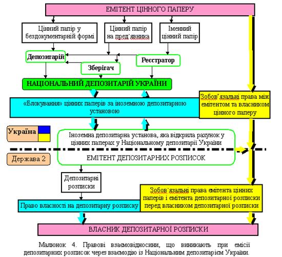 Реалізація випуску депозитарних розписок іноземною депозитарною установою, яка не є власником цінних паперів українських емітентів, повинна дотримуватися нормативно - правових актів України. Законодавством встановлюється, що тільки Національний депозитарій України встановлює кореспондентські відношення з депозитарними установами інших країн і укладає з ними договори щодо обслуговування розміщення і продажу за межами України цінних паперів українських емітентів, у тому числі, американських депозитарних розписок (American Depositary Receipts) і глобальних депозитарних розписок (Global Depositary Receipts).