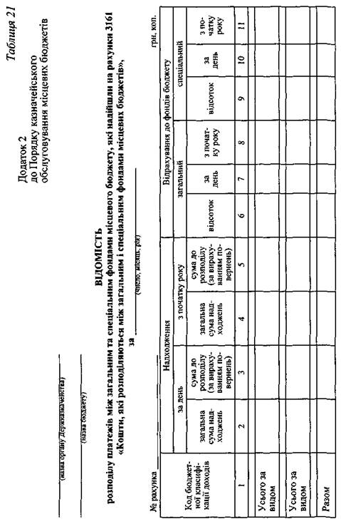 За результатами розподілу платежів між загальним та спеціальним фондами місцевих бюджетів формується Відомість розподілу платежів між загальним та спеціальним фондами місцевого бюджету, які надійшли на рахунки 3161 (табл. 21), та засобами програмного забезпечення у регламентованому режимі проводиться перерахування розподілених коштів на відповідні рахунки.
