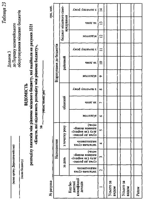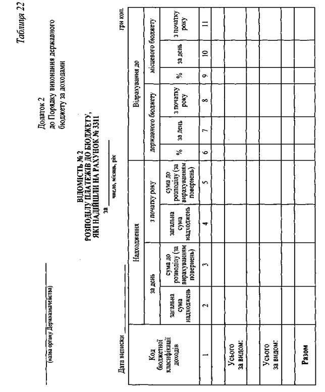 За результатами розподілу платежів між державним бюджетом та бюджетами Автономної Республіки Крим, областей, міст Києва і Севастополя або між рівнями місцевих бюджетів формується відповідно Відомість розподілу платежів до бюджету, які надійшли на рахунок 3311 (табл. 22) або Відомість розподілу платежів між рівнями місцевого бюджету, які надійшли на рахунки 3321 «Кошти, які підлягають розподілу між рівнями бюджету» (табл. 23).
