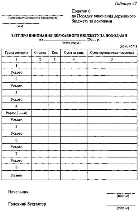 На підставі даних про рух коштів на аналітичних рахунках, відкритих за балансовими рахунками 3111, 6111, 3121, 6112, 3131, 6113, 3522, 6114, щоденно на початку наступного операційного дня, не пізніше 9-ї години ранку, управління Державного казначейства складають Звіт про виконання Державного бюджету за доходами ф. 412-Д (табл. 27) у розрізі видів надходжень у цілому по області та передають його (в електронному вигляді) до Державного казначейства України (центральний рівень).