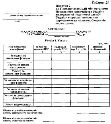 Щомісячно, не пізніше четвертого числа місяця, наступного за звітним, управління (відділення) Державного казначейства проводять з відповідними органами податкової служби звірку доходів за всіма кодами бюджетної класифікації на підставі даних про надходження до Державного і місцевих бюджетів та відомостей розподілу коштів станом на перше число місяця, наступного за звітним. За результатами складаються акти звірки надходжень до бюджету за розділом 1 «Усього» (табл. 29), розділом 2 «Грошові надходження в національній валюті», розділом 3 «Грошові надходження в іноземній валюті», розділом 4 «За іншими видами надходжень» та розділом 5 «Взаєморозра-хунки між бюджетами». Акти звірки органів, підпорядкованих Державному казначейству, Державній податковій адміністрації, разом зі звітами про виконання дохідної частини Державного та відповідних місцевих бюджетів у терміни, передбачені для надання звітів, в обов'язковому порядку надсилаються до органів вищого рівня.