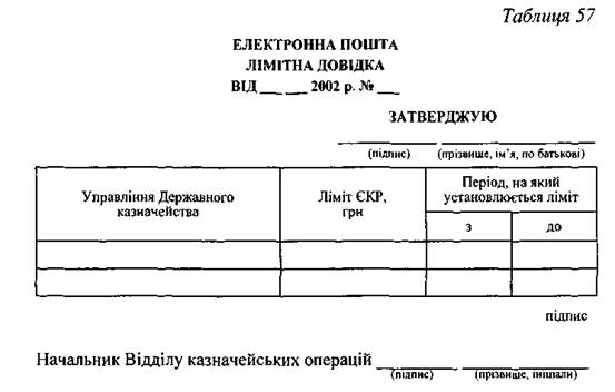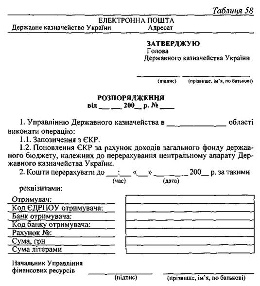 Для перерахування коштів з ЄКР центральному апарату Державного казначейства України, у тому числі перевищення встановленого ліміту ЄКР, Управління фінансових ресурсів готує розпорядження Державного казначейства України (табл. 58). Розпорядження підписує начальник Управління фінансових ресурсів або його заступник (начальник Відділу внутрішніх казначейських операцій) та затверджує Голова Державного казначейства України або його заступник. Далі управління фінансових ресурсів засобами електронного зв'язку доводить розпорядження до виконання управлінням Державного казначейства та надає копію розпорядження Управлінню консолідованої звітності. Кошти, отримані від управлінь Державного казначейства згідно з розпорядженням, Управління консолідованої звітності відображає в бухгалтерському обліку як зобов'язання Державного казначейства України перед управліннями Державного казначейства.