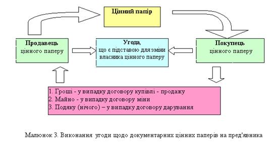 Відповідно до українського законодавства підтвердженням права власності на цінний папір на пред’явника є сертифікат (відповідно до Закону України “Про Національну депозитарну систему та особливості електронного обігу цінних паперів в Україні” Сертифікат - бланк цінного паперу, який засвідчує право власності на цінний папір). Виконання угоди щодо цінних паперів на пред’явника здійснюється досить просто (малюнок 3). Документарні цінні папери на пред’явника є яскравим прикладом сполучення зобов'язальних і майнових прав. Момент передачі цінних паперів на пред'явника новому власнику є і моментом, коли зобов'язання емітента цінних паперів також переходять до цього ж власника. Процес переходу прав на цінний папір на пред’явника відбувається “миттєво” шляхом передачі сертифікату цінного паперу від продавця покупцю (згідно ст.5 Закону України “Про Національну депозитарну систему та особливості електронного обігу цінних паперів в Україні” “Право власності на цінні папери на пред'явника, випущені в документарній формі, переходить до нового власника з моменту передачі (поставки) цінних паперів”).