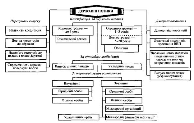 Державні позики відбивають взаємовідносини між державою як позичальником і юридичними та фізичними особами, урядами інших країн та міжнародними фінансовими організаціями як кредиторами. Державні позики класифікуються за різними ознаками (рис. 7).