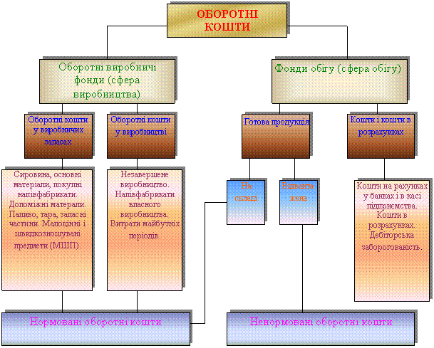 Розподіл оборотних коштів на оборотні виробничі фонди і фонди обігу обумовлюється особливостями їхнього використання і розподілу в сферах виробництва продукції і її реалізацій.[7, 60-69]