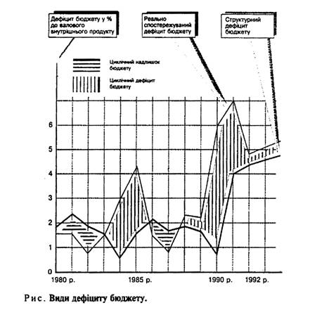 Важливо зазначити, що в зарубіжній літературі розрізняють реально спостережуваний, структурний і циклічний дефіцити бюджету. На рисунку (приклад, характерний для США) показані види дефіциту бюджету.