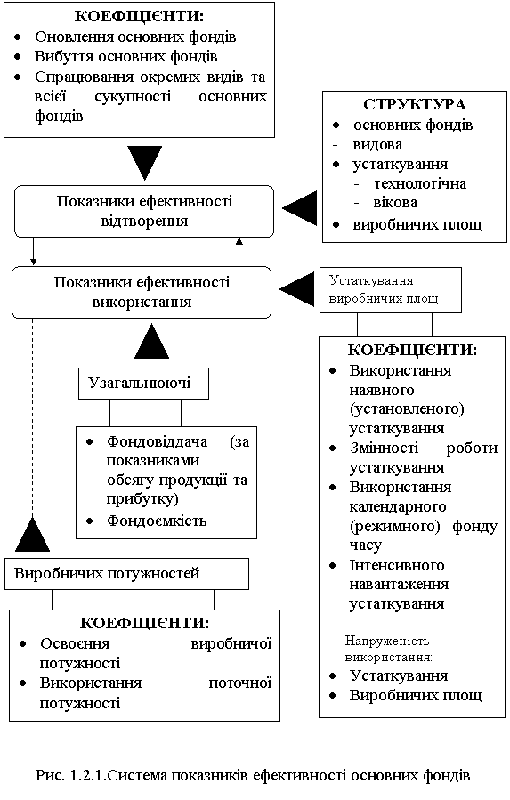 Система показників, яка всебічно може характеризувати ефективність основних фондів, охоплює два їх блоки: перший – показники ефективності відтворення окремих видів і всієї сукупності засобів праці; другий – показники рівня використання в цілому і окремих видів основних фондів (рис. 1.2.1.)