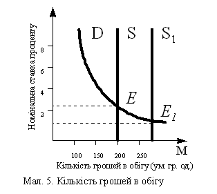 Які реальні процеси iлюструє мал. 5? При збільшенні пропозиції грошей виникає їх короткочасний надлишок. Люди прагнуть зменшити кількість своїх грошових запасів шляхом покупки інших фінансових активів (наприклад, облігацій). Попит на них зростає, ціни, відповідно, збільшуються. Процентна ставка, чи альтернативна вартість зберігання не приносящих відсотків грошей, падає. Оскільки ликвiдність стає меньш дорогою, населення і фірми поступово збільшують кількість готівки і чекових вкладів, що вони готові держати на руках, і відбудовується рівновага на грошовому ринку при більшій пропозиції грошей і меншому проценті.