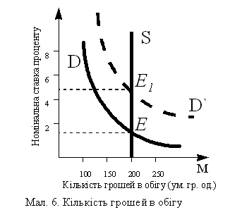 Мал. 6 iлюструє наступні реальні процеси. Хай попит на гроші зріс внаслідок зростання номiнального ВНП, тобто населення і фірми хочуть держати більше активів у вигляді готовиз грошей і чекових вкладів, продавая для цього інші авуари (наприклад, облігації). Але при незмінній пропозиції грошей рівновага на грошовому ринку може бути установлена тільки при зростанні "ціни" грошей, чи номiнальної ставки проценту.