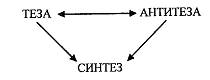 Синтез, у свою чергу, заперечує антитезу, стає вихідним моментом наступного руху і об’єднує в собі риси двох попередніх ступенів, повторюючи їх на вищому рівні.