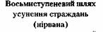 Припинення страждань- це усунення земних пристрастей, всього того, що зв'язує людину із світом. Стан звільнення означає згасання при страстей - нірвану. Вчинки людини, яка досягла згасання пристрастей, позбавлені жаги життя, прив'язаності до нього, не породжують долю (карму) і, отже, переродження. Згасання пристрастей -це етап безтурботності, незворушеності і неупередженого самовладання людини, пояснити його у поняттях повсякденного досвіду неможливо. Згасання пристрастей можна досягти і в сучасному житті, якщо суворо дотримуватися шляху - маргу, яким йшов Будда і якого можуть дотримуватися інші. Шлях марга має назву восьмиступеневий благородний шлях. Оскільки визначною причиною страждань людини, за вченням Будди, є незнання і помилки, що випливають, то найперша умова звільнення - формування правильних поглядів: засвоєння суті буддизму, чотирьох благородних істин. Для перетворення життя необхідно також долати недобрі нахили і наміри, ворожнечу до людей. Людина має уникати неправди, наклепів, брутальності, не завдавати шкоди всьому живому, не красти, не вдаватися до недо-зволеного у досягненні своєї мети, здобувати засоби до існування лише чесним шляхом. Правильна рішучість - саммасакаппа - контролює людину: спілкування, поведінку і, нарешті, весь спосіб життя. Але навіть дотримуючись правил уникнення страждань, загальноприйнятих норм поведінки, людина не застрахована від втрати здобутого. Причина найчастіше прихована у закоренілих звичках та ідеях, що за сприятливих умов обов'язково проявляться. Єдиний засіб, що дозволяє протистояти закоренілим звичкам і появі шкідливих ідей - це правильне зусилля - саммаваява, тобто вироблення протилежних звичок та ідей.