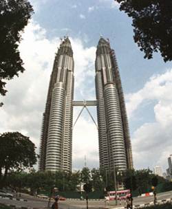 | 2/3. Пертонас, Малайзія (Petronas Twin Towers – 452 м, 88 поверхів, 1998 рік) У проекті башт Петронас архітектор Сезар Пеллі (Cesar Pelli) використав елементи ісламського мистецтва. Залізобетонні «близнюки» з’єднані на рівні 41 і 42 поверхів містком, який був створений як коридор безпеки на випадок пожежі. Петронас оснащені 78 ліфтами. В одній з будівель розташована штаб-квартира нафтової компанії Petronas, в іншій – офісний центр. |